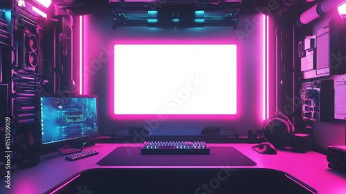 screen, computer, gaming, neon, light, keyboard, mouse, desk, room, technology, digital, future, pink, purple, blue, vibrant, bright, modern, stylish, cool, background, blank, empty, space, design, illustration, render, three-dimensional, graphic, equipment, setup, workstation, arena, display, monitor, control, interface, system, electric, power, glow, colours, dark, night, futuristic, innovation, advanced, high technology, virtual