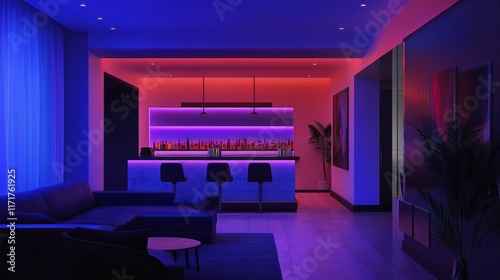 lounge, bar, interior, purple, blue, pink, neon, lighting, modern, sleek, stylish, home, design, room, furniture, sofa, sectional, chair, stool, counter, bottle, alcohol, drink, minimalist, night time, ambience, relaxing, calm, sophisticated, cosy