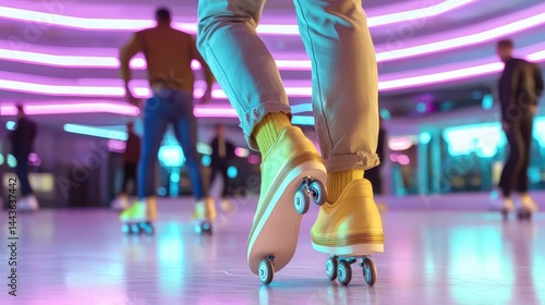 Neonlit Roller Skating Rink Person in Pastel Pants and Yellow Roller Skates Blurred Background Colorful Lighting Retro Vibe Fun Activity Leisure Recreation Smooth Surface