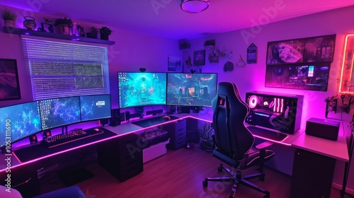 Neon-lit room showcasing a sleek gaming chair, multi-monitor setup with a stream live on the center display.