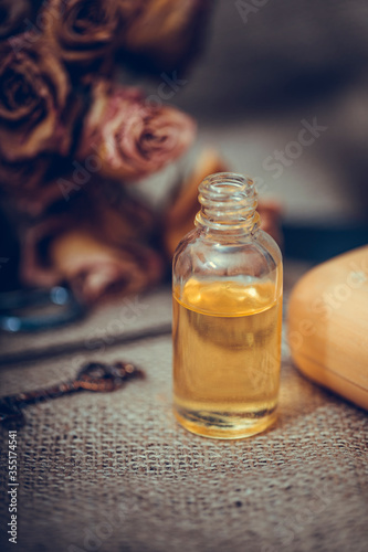 Neroli essential oil in a glass bottle with dried flowers on old textured wooden background. Selective focus.