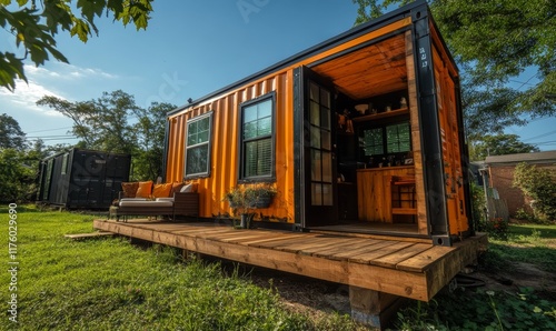 Nestled in a lush green backyard, this modern shipping container home boasts a wooden deck. Perfect for highlighting sustainable, eco-friendly living