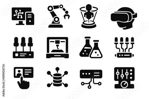 vector, icon, datum, panel, network, light, sensor, robotic, hub, flask, virtual, printer, chemical, module, ai, control, array, arm, holographic, interface, headset, display, led, workstation, silhouette, set, black, symbol, pictogram, solid, collection, glyphs