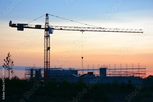 Neubau Immobilien mit Baumascinen und Kran auf Hochbau Baustelle bei Sonnenaufgang