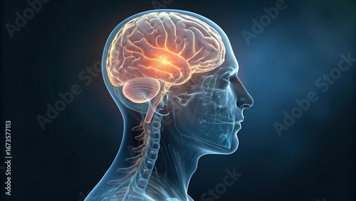 Neurology injury support. The brain anatomy with glowing areas, neural activity.