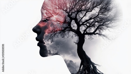 Neuroplasticity concept A silhouette of a woman's face merged with a tree, symbolizing nature and self-reflection.