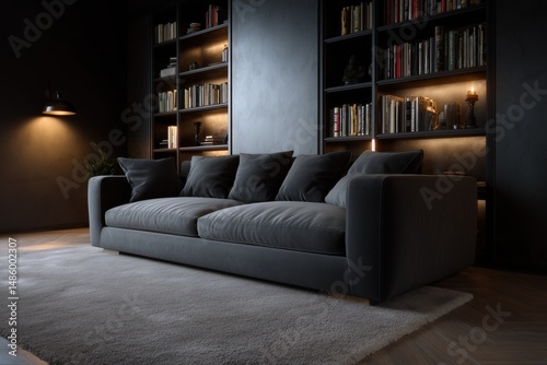 neutral minimalist interior, gray sofa, soft rug, open bookshelf, soft ambient lighting, Scandinavian design, stylish and cozy