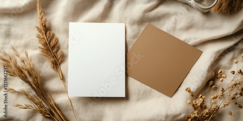 Neutral stationery mockup with brown and white cards and dried plants. Generative AI