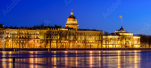 Neva river embankment panoramic landscape in Saint Petersburg. St. Isaac's Cathedral and the buildings on the waterfront in beautiful night lighting, Saint-Petersburg, Russia