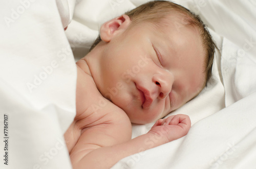 New born baby boy sleeping. Baby taking a nap in white sheets.
