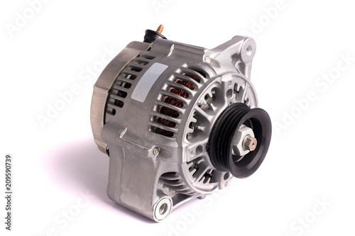 New car power generator, isolated on white background. Details of the engine of the car.