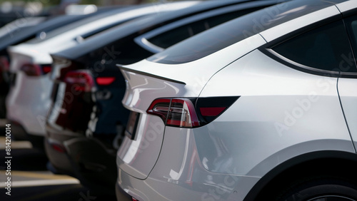 New electric car inventory parked at dealership lot outdoors, Modern eco vehicles with focus on rear tail lights
