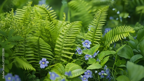 New Fronds of Ferns Unfurling Amid Lush Green Background
