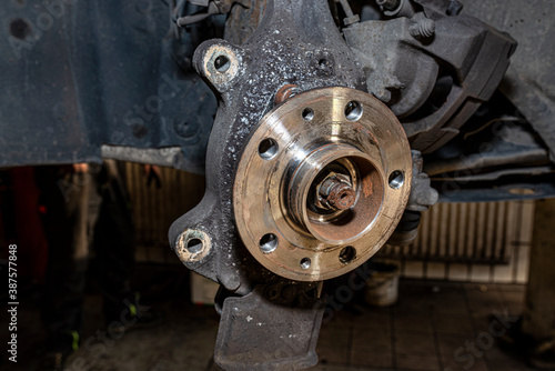 steering, shaft, axle, car, bearing, new, workshop, friction, bolt, assembly, holder, workplace, replace, transport, caliper, circle, shiny, front, break, work, rotor, closeup, repair, automobile, vehicle, disc, garage, wheel, shop, auto, automotive, service, part, metal, mechanic, technology, steel, substitution, change, mechanical