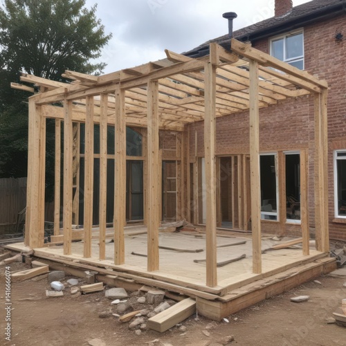 construction, building, house, home, wood, architecture, frame, wooden, sky, new, roof, structure, build, window, framing, blue, development, timbering, housing, site, residential, timber, exterior, concrete