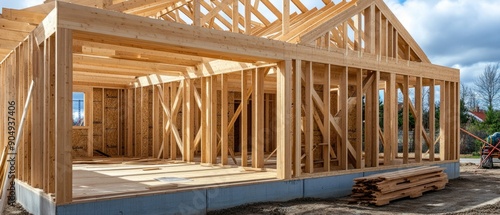 New house under construction. Wooden frame with truss, post and beams. Manufacture of houses made of wood