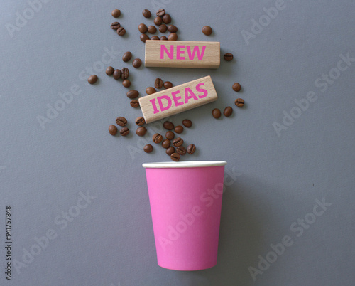 New ideas symbol. Concept word New ideas on wooden blocks. Beautiful grey background with coffee beans and cup. Business and New ideas concept. Copy space