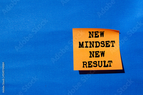 New mindset new result message written on orange paper on blue background. Conceptual new mindset new result symbol. Copy space.