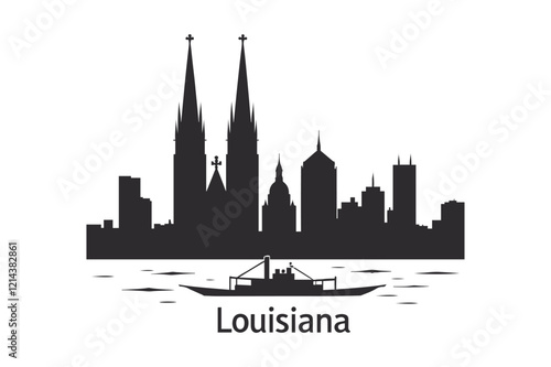 new, orleans, louisiana, skyline, louis, cathedral, steamboat, vector, illustration, graphic, design, art, clip art, print, web, poster, booklet, logotype, travel, tour tourism, urban, city landscape, landscape, iconic, panoramic, silhouette, modern, traditional, historic, exploration, landmark, serene, tranquil, educational, environment, majestic, bold, minimalist, contemporary, heritage, southern, scenic, nature, adventure, vibrant, colourful, river, water
