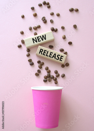 New Release symbol. Concept word New Release on wooden blocks. Beautiful pink background with coffee cup. Business and New Release concept. Copy space