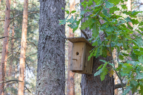 New wooden birdhouse on a tree for forest birds in the forest