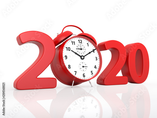 New Year 2020 and Red Alarm clock. 3d rendering