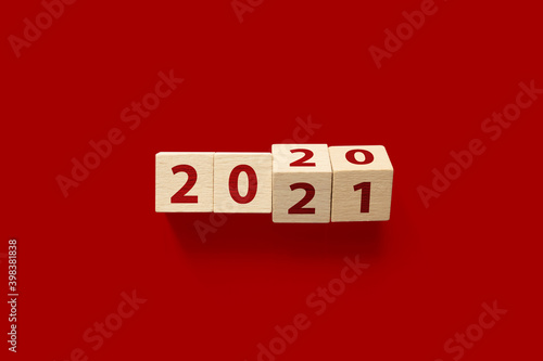 New year 2020 change to 2021 concept. Wooden cube block flip change year on red background