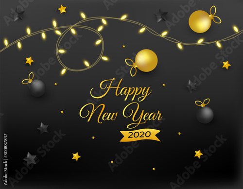 New Year 2020 festive background with decorative glittering lamps and stars suitable for poster, invitation card.