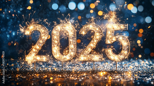 New Year 2025 festive background the numbers 2025 surrounded by vibrant fireworks, bokeh lights, sparkling confetti, and glittering ornaments, creating a lively poster atmosphere for celebration