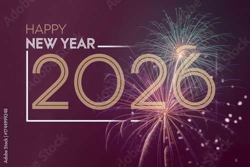 New Year 2026 card with gold typography and structured fireworks on deep burgundy for vintage flair