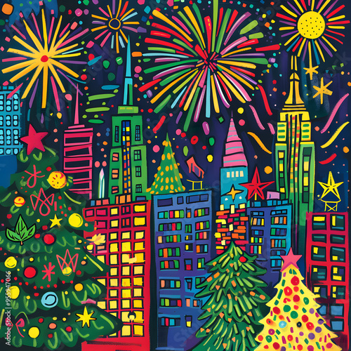 New Year and Christmas card, graphic advertising backgrounds in a doodle 2D illustrator style