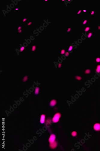 New Year and Christmas color illumination. The illusion of a salute explosion. The quirks of light fiber optic lamp. Blurry circles, bokeh on a dark background. Big explosion.