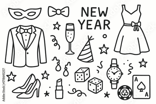 new, year, casino, celebration, hand, drawn, doodle, illustration, fashion, mask, bow tie, dress, icon, tuxedo, champaign, flute, party, hat, heel, earring, star, lipstick, dice, confetti, watch, clover, chips