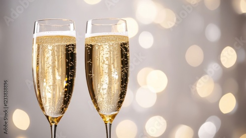 New Year celebration concept with champagne glasses against a soft bokeh background ideal for festive announcements or greetings.