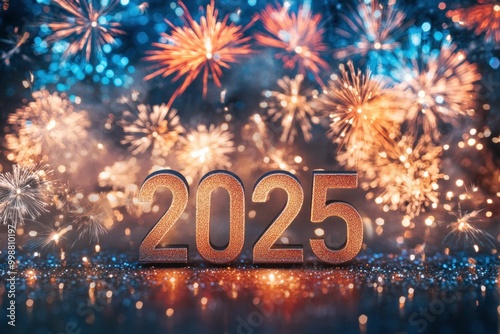New Year celebration with fireworks and sparkling numbers Colorful explosions illuminate the night sky with a festive atmosphere Glimmering background enhances the jubilant mood
