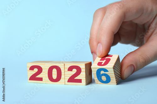 New Year. Woman flipping cube with numbers 5 and 6 to make 2026 on grey background, closeup
