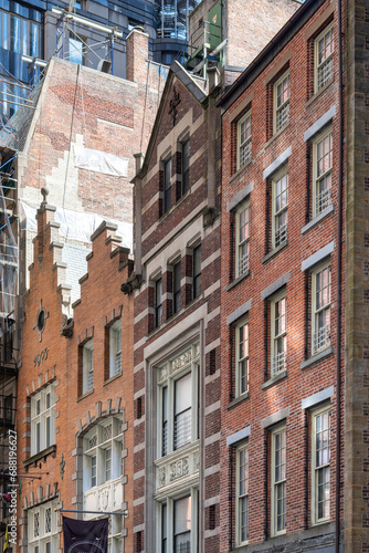 New York City, NY, USA, Low angle view of some of the historic buildings on Stone Street of former New Amsterdam in Manhattan with modern high rise in the background