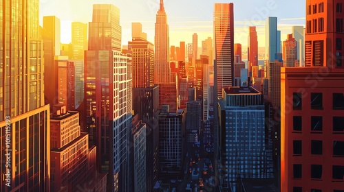 New York Skyscrapers in an animated style, 2D, Cityscape, Skyscraper level, light motion blur, golden hour, cinematic side lighting, v6