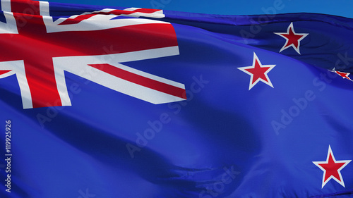 New Zealand flag waving against clean blue sky, close up, isolated with clipping path mask alpha channel transparency