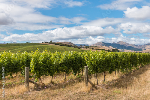 vine, grapevine, vinery, slope, new zealand, hill, mountain chain, summer, green, foliage, vine-growing, agriculture, leaf, plant, countryside, field, row, grass, sky, cloud, copy space, arid, dry, fertile, landscape, pasture, meadow