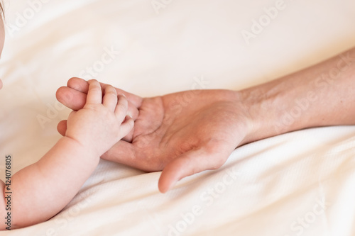 Newborn baby grasping her mother's finger. Concept of child care, feeling safe, parent love.