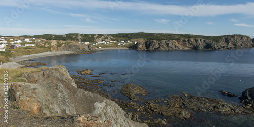 bay, beach, canada, cliff, coast, color image, horizontal, house, newfoundland, no people, north america, ocean, outdoors, panoramic, photo, rock, scenic, sky, tour tourism, town, tranquil scene, travel destination, water, waterfront
