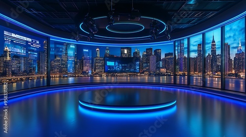 studio, news, television, broadcasting, media, set, city, night, city landscape, window, screen, light, desk, floor, background, interior, design, modern, technology, video, camera, production, broadcast, television, recording, anchor