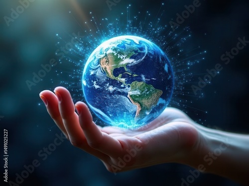Next generation technology.Global networking connection,science, innovation and communication technology.Metaverse Technology.Hand holding earth globe with data exchanges on connec.