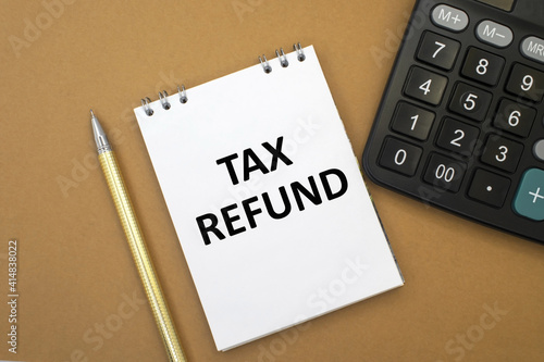 Next to the black calculator is a white notebook with the inscription tax refund.