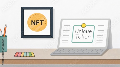 digital, art, artwork, token, framed, laptop, desktop, screen, coin, gold, unique, online, illustration, display, presentation, icon, graphic, technology, modern, business, finance, investment, trading, exchange, market, value, buy, sell, create, collect, virtual, asset, property, gallery, wall, simple, layout, desk, workspace, monitor, web, interface, code, creator