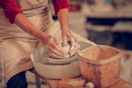 clay, pot, creative, woman, skill, professional, inspiration, creativity, inspired, artist, art, workshop, indoor, hand-made, hobby, interested, idea, apron, working, closeup, skilful, art, hand, daytime, pottery, person, alone, focused, workplace