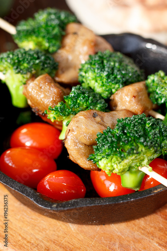 meat, broccoli, food, vegetable, green, organic, fresh, lifestyle, cut, diet, dinner, freshness, healthy, ingredient, leaf, wooden, board, table, floret, crown, tomatoes, cherry tomato, frying pan, pan, fries, grilled, cooked, dish, pita, bread, skewer