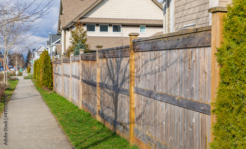 Nice wooden fence around house. Wooden fence with green lawn and trees.