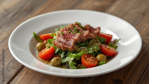 food, salad, tomatoes, healthy, olive, meal, ingredient, culinary, lettuce, seasoning, french, tuna, salted, radish, traditional, anchovy, raw, hard boiled egg, closeup, eat, fresh, prepare, seared, serving